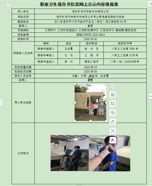 德阳利宇风和新材料有限公司职业病危害因素定期检测
