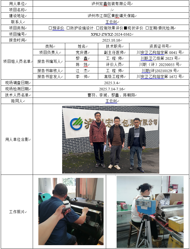 泸州宏鑫包装有限公司职业病危害因素现状评价