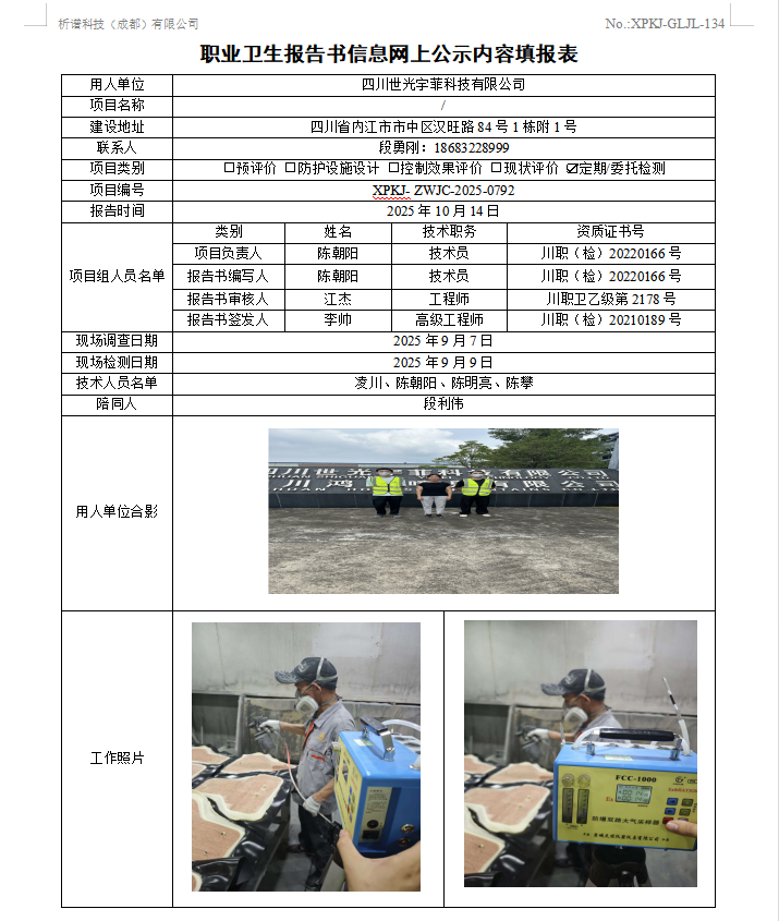 四川世光宇菲科技有限公司职业病危害因素定期检测
