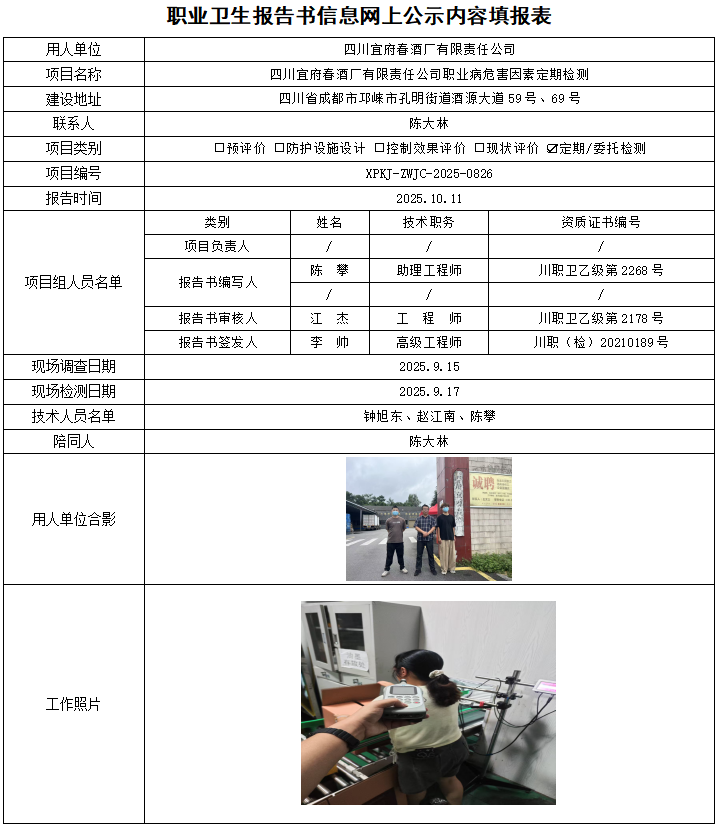 四川宜府春酒厂有限责任公司职业病危害因素定期检测