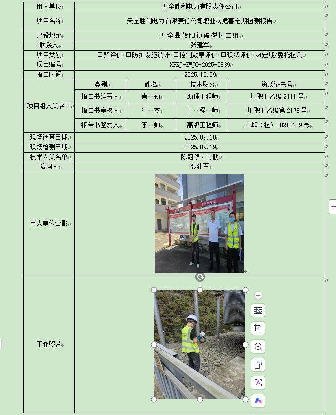天全胜利电力有限责任公司职业病危害因素定期检测