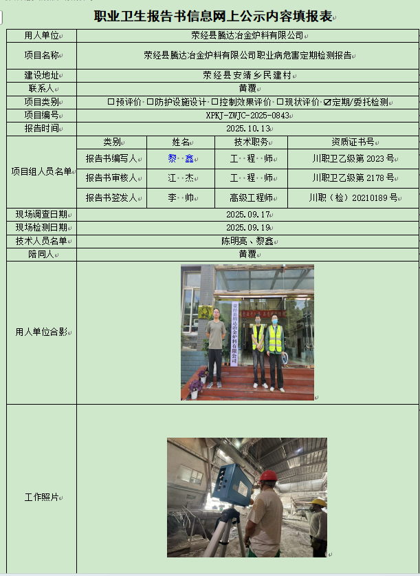 荥经县腾达冶金炉料有限公司职业病危害因素定期检测