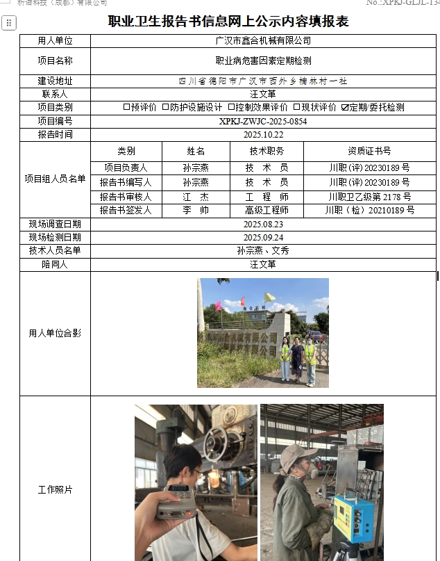广汉市鑫合机械有限公司职业病危害因素定期检测