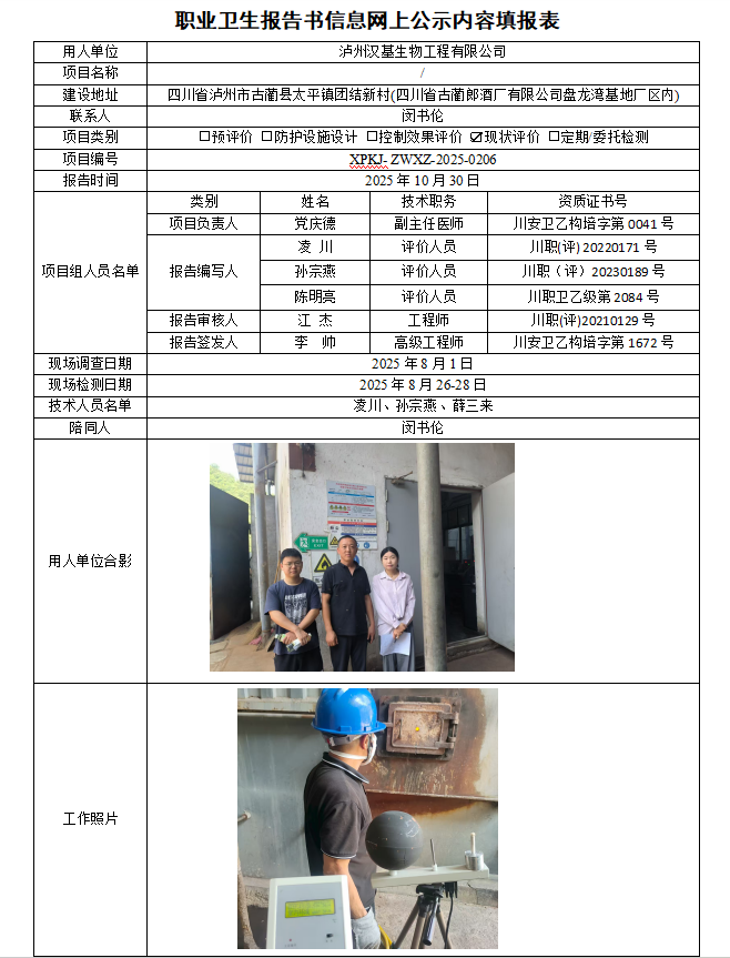 泸州汉基生物工程有限公司职业病危害因素现状评价