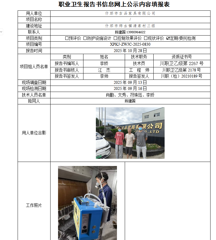 什邡市吉品家具有限公司职业病危害因素定期检测