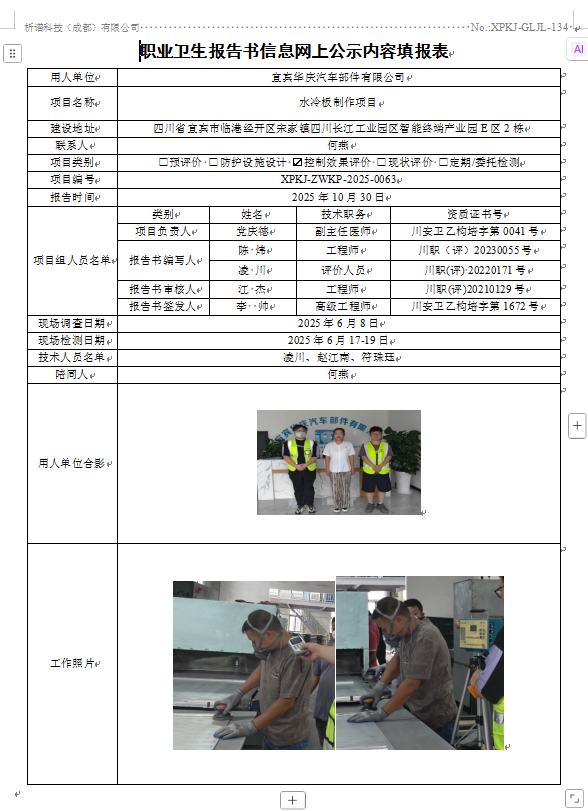 宜宾华庆汽车部件有限公司职业病危害因素控制效果评价