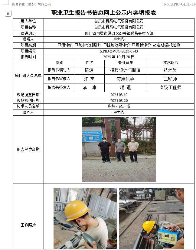 自贡市科泰电气设备有限公司职业病危害因素定期检测