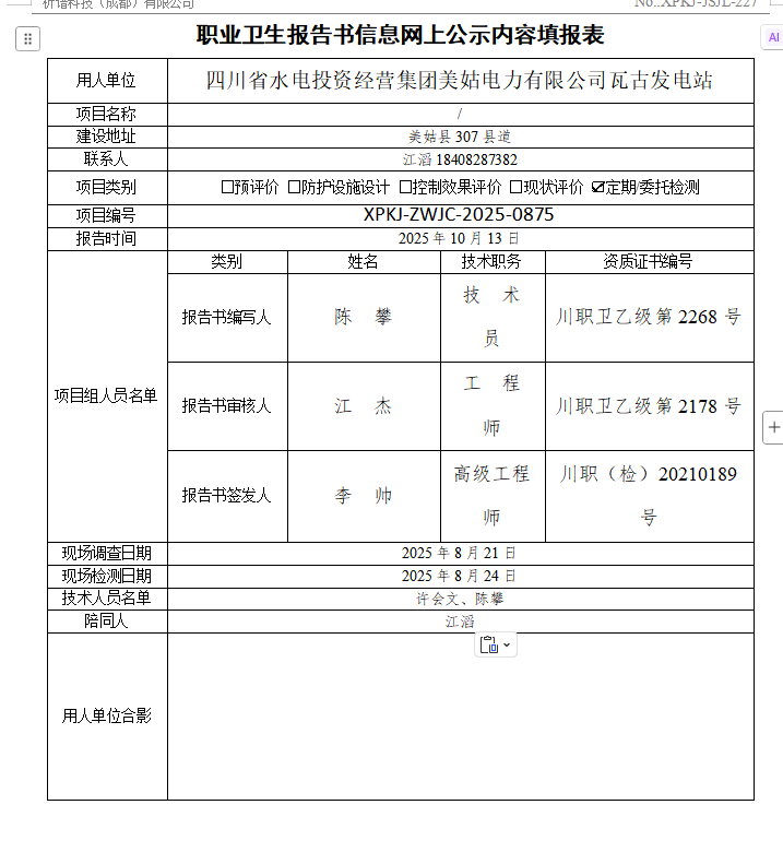 成都大信智慧交通科技有限公司职业病危害因素定期检测