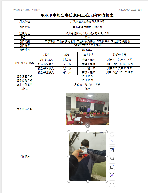 成都市蜀望罐头食品有限公司职业病危害定期检测