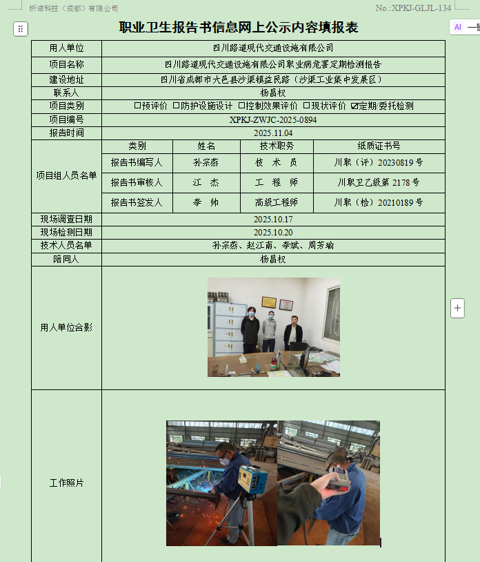 四川鑫锦程科技发展有限公司职业病危害定期检测