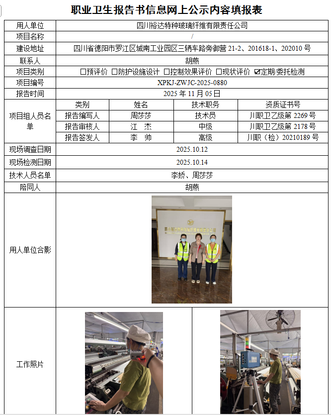 四川裕达特种玻璃纤维有限责任公司职业病危害定期检测