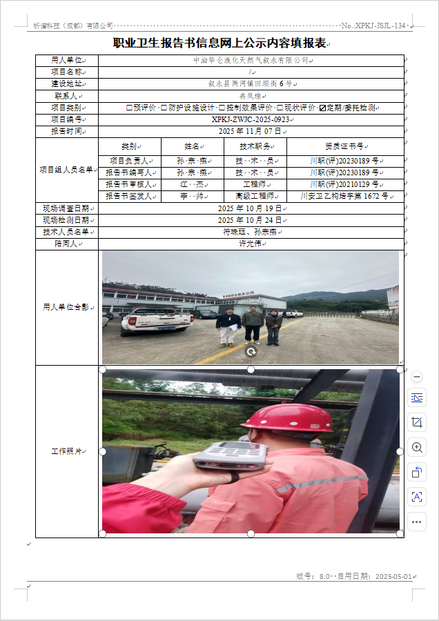 中油华仑液化天然气叙永有限公司职业病危害定期检测