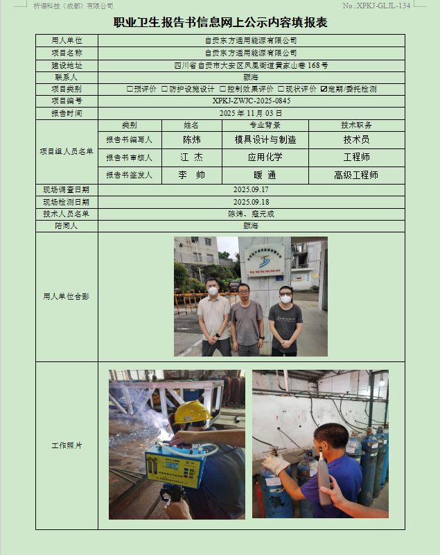 自贡东方通用能源有限公司职业病危害定期检测