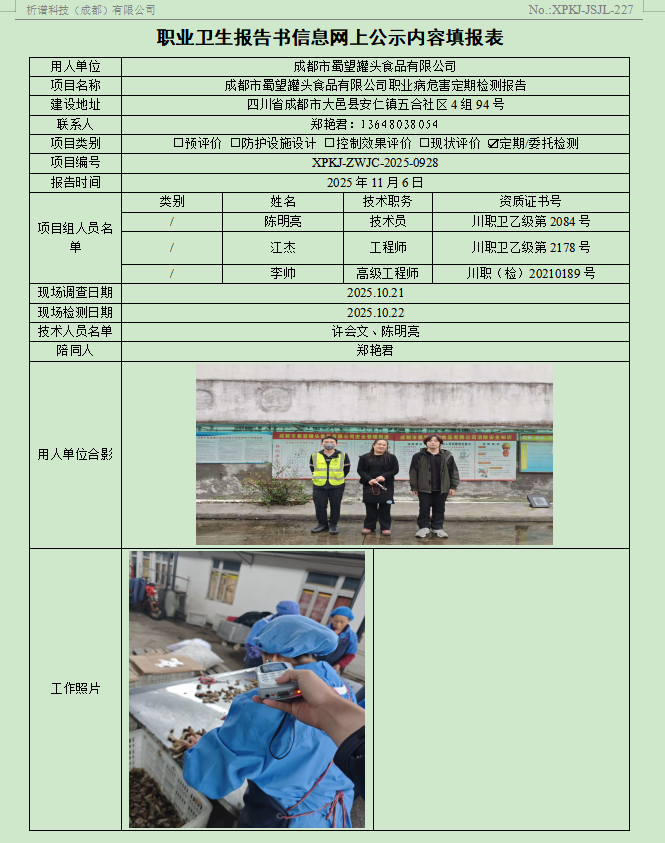 成都市蜀望罐头食品有限公司职业病危害定期检测