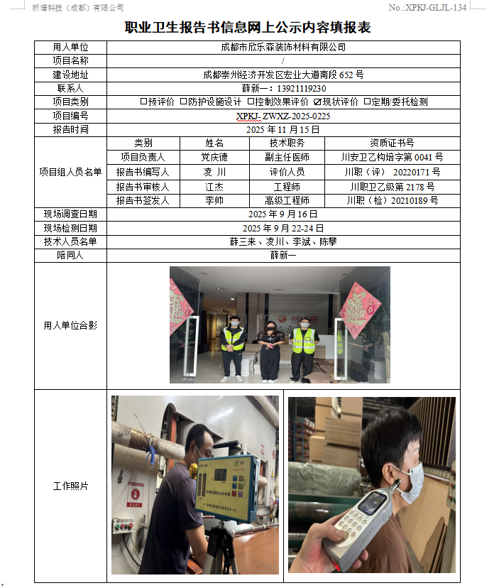 成都市欣乐森装饰材料有限公司职业病危害现状评价