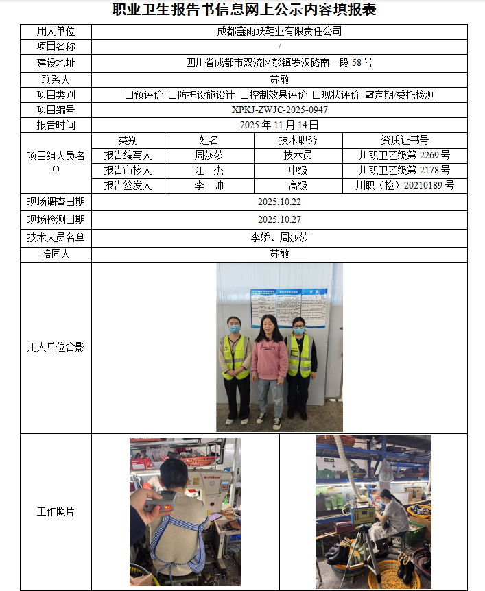 成都鑫雨跃鞋业有限责任公司职业病危害定期检测