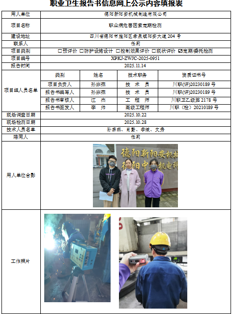 德阳新阳安机械制造有限公司职业病危害定期检测