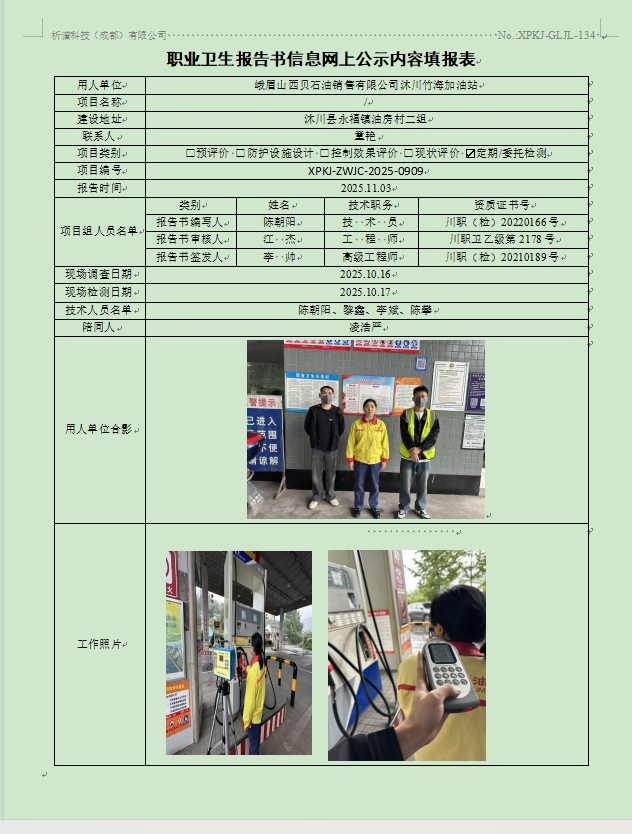 峨眉山西贝石油销售有限公司沐川竹海加油站职业病危害定期检测