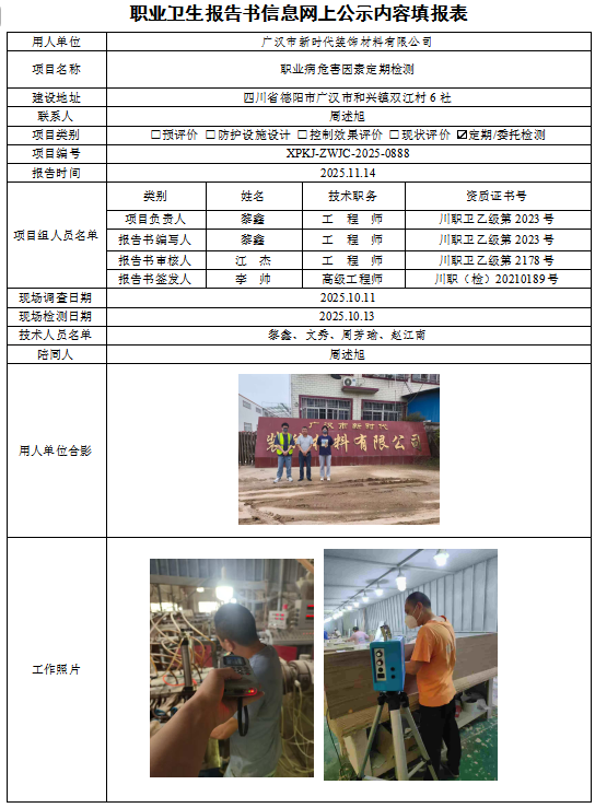 广汉市新时代装饰材料有限公司职业病危害定期检测