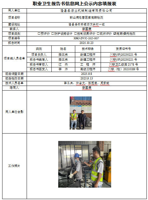 隆昌县宏业机械制造有限责任公司职业病危害定期检测