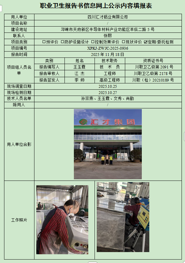 四川汇才铝业有限公司职业病危害定期检测