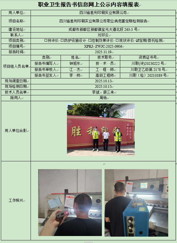 四川省胜利印刷实业有限公司职业病危害定期检测