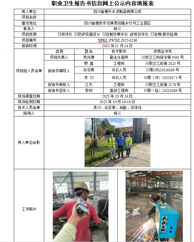 四川省穗升水泥制品有限公司职业病危害现状评价