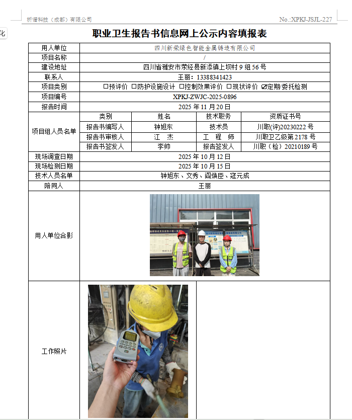 四川新荣绿色智能金属铸造有限公司职业病危害定期检测