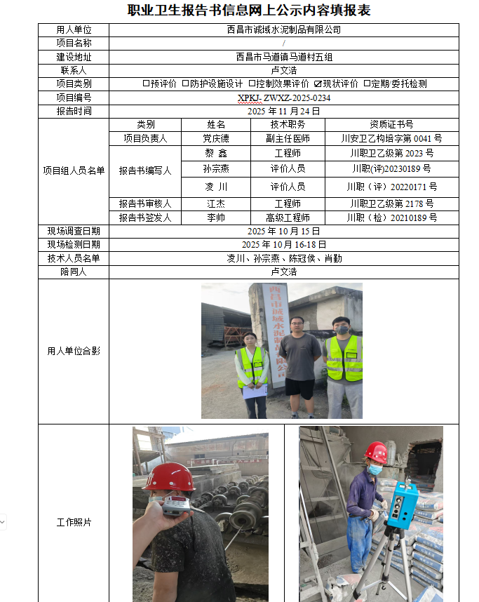 西昌市诚域水泥制品有限公司职业病危害现状评价