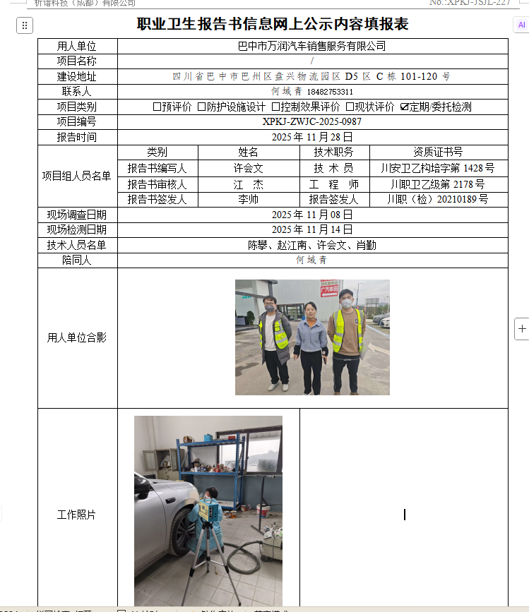 巴中市万润汽车销售服务有限公司职业病危害因素定期检测