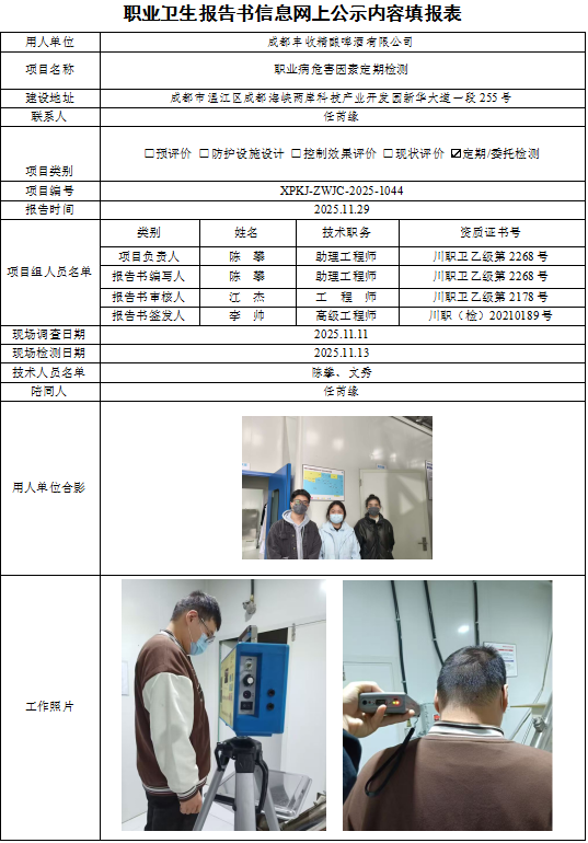 成都丰收精酿啤酒有限公司职业病危害因素定期检测
