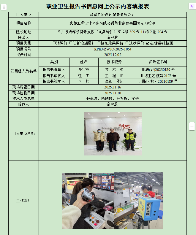 成都汇彩设计印务有限公司职业病危害因素定期检测