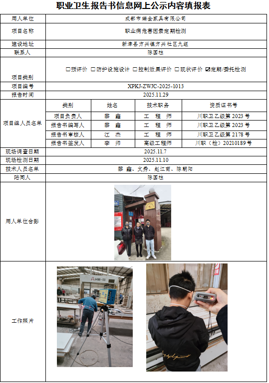 成都市瑞金家具有限公司职业病危害因素定期检测
