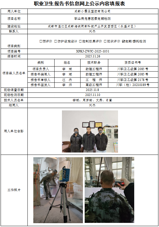 成都小霸王塑胶有限公司职业病危害因素定期检测