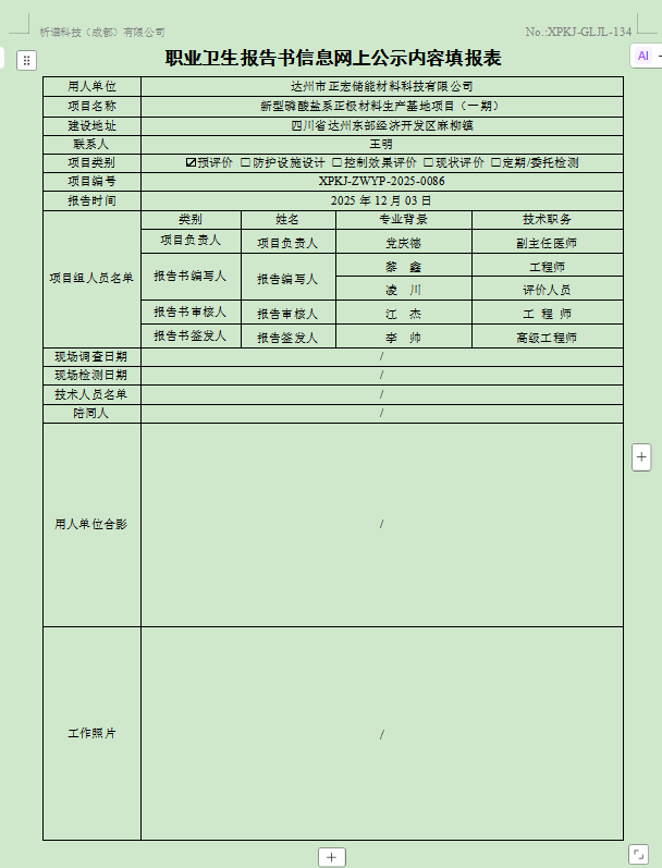 达州市正宏储能材料科技有限公司职业病危害预评价