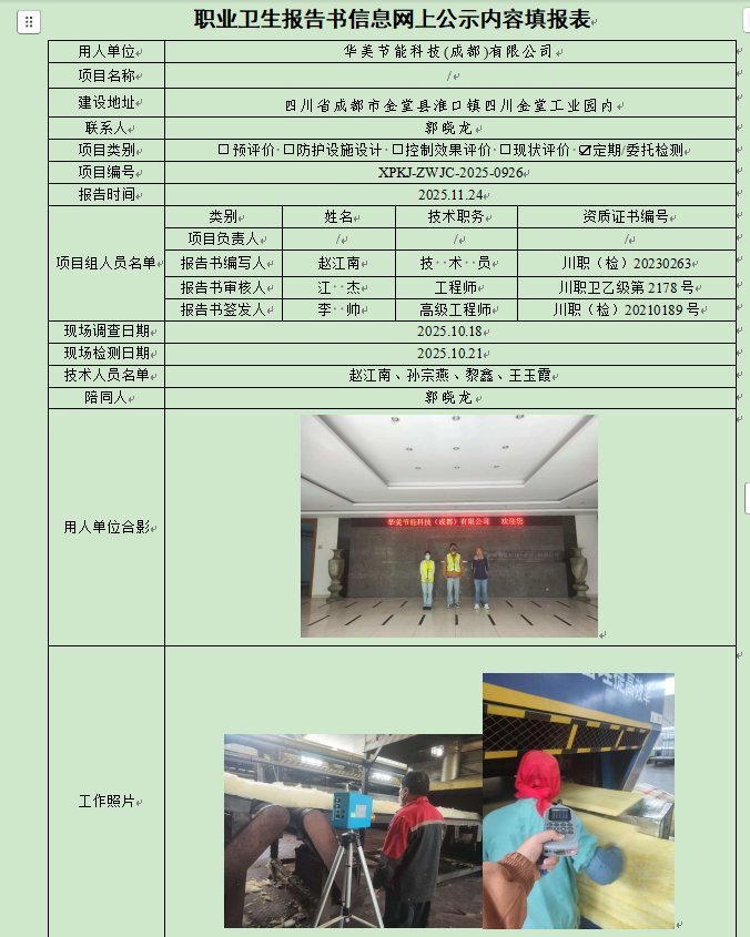 华美节能科技(成都)有限公司职业病危害因素定期检测