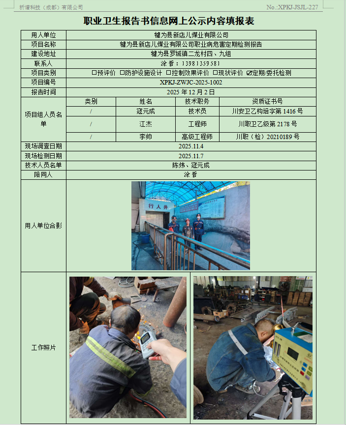 犍为县新店儿煤业有限公司职业病危害因素定期检测