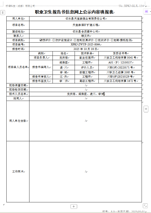 邻水县天宝寨煤业有限责任公司职业病危害预评价