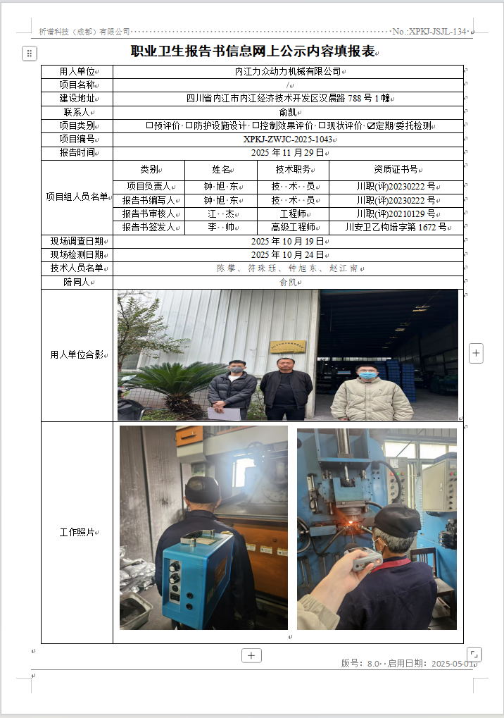 内江力众动力机械有限公司职业病危害因素定期检测
