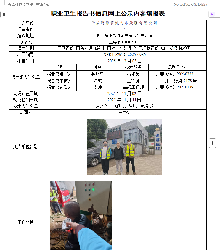 平昌泓源青流污水处理有限公司职业病危害因素定期检测