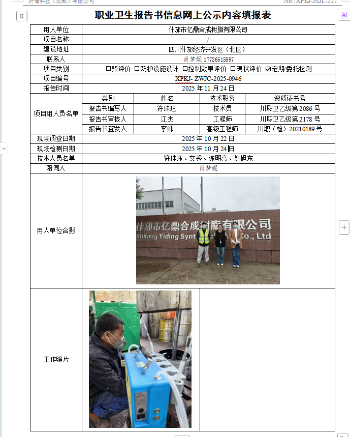 什邡市亿鼎合成树脂有限公司职业病危害因素定期检测