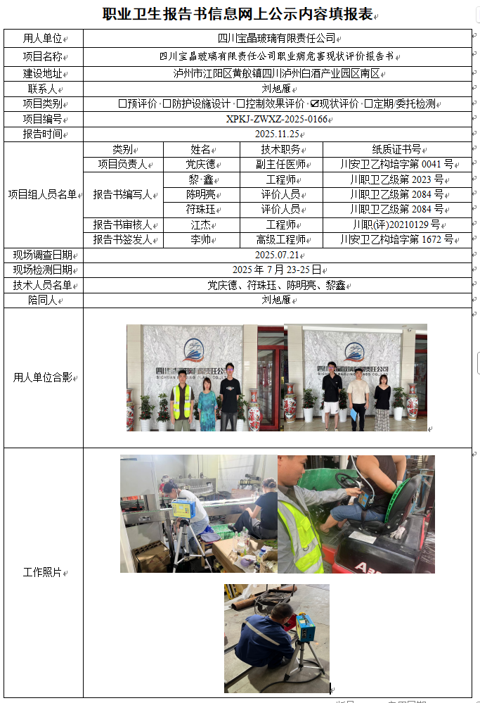 四川宝晶玻璃有限责任公司职业病危害现状评价