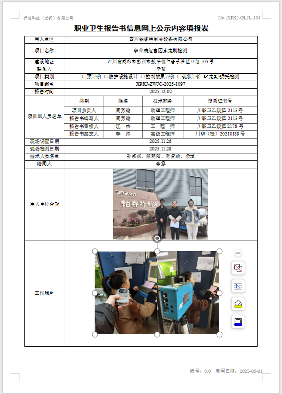 四川铂睿特制冷设备有限公司职业病危害因素定期检测