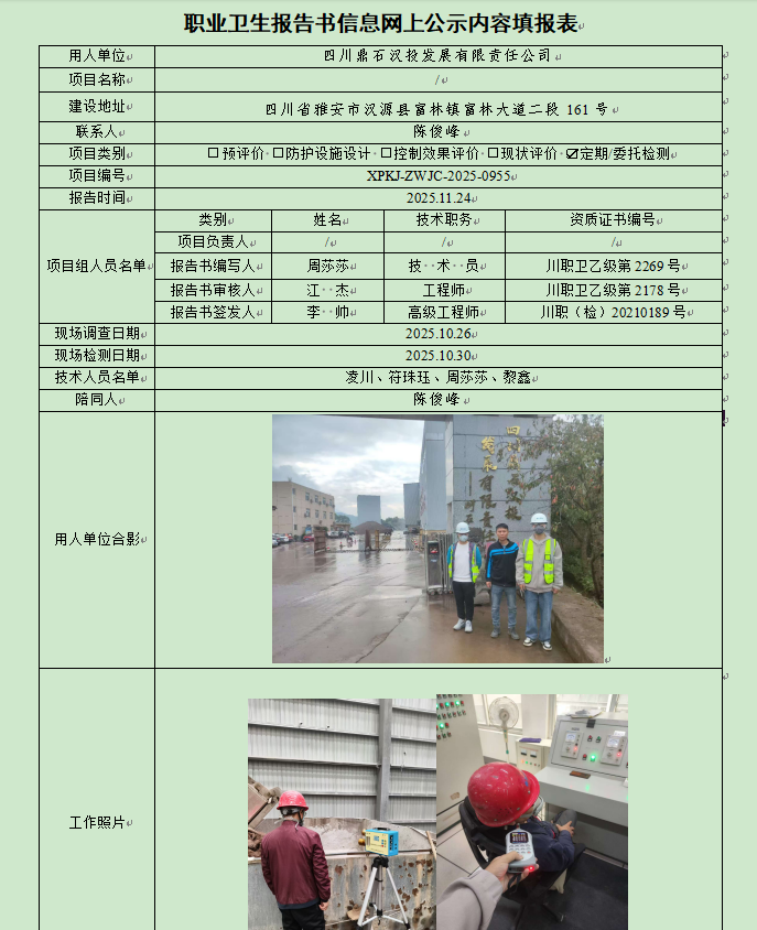 四川鼎石汉投发展有限责任公司职业病危害因素定期检测