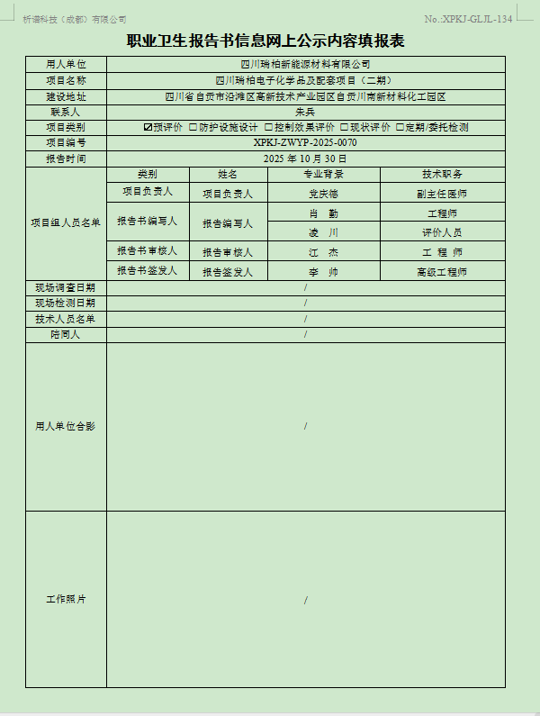 四川瑞柏新能源材料有限公司职业病危害预评价