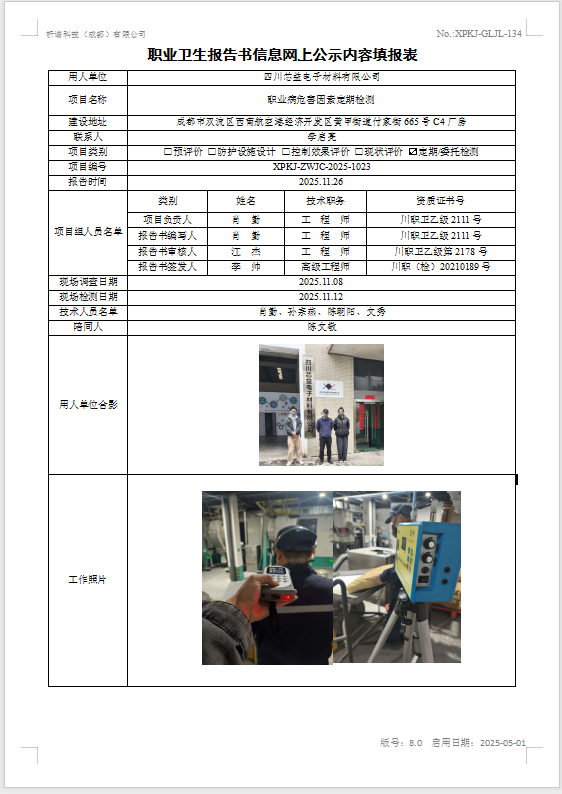 四川芯益电子材料有限公司职业病危害因素定期检测