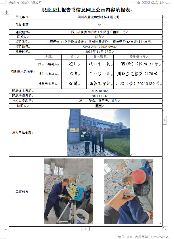 四川易霖诚泰新材料有限公司职业病危害因素定期检测