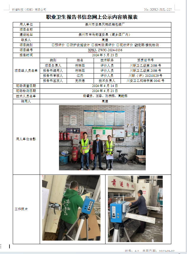 崇州市安阜天瑞纸箱包装厂定期检测