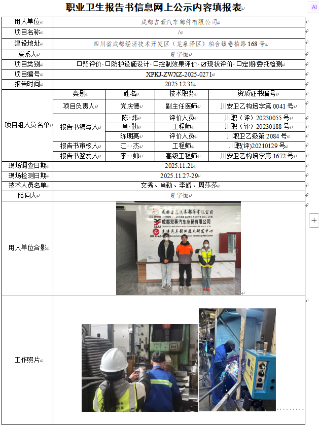 成都吉豪汽车部件有限公司职业病危害现状评价