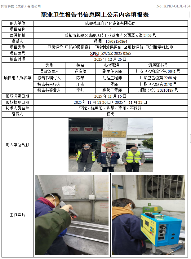 成都隽辉自动化设备有限公司职业病危害现状评价